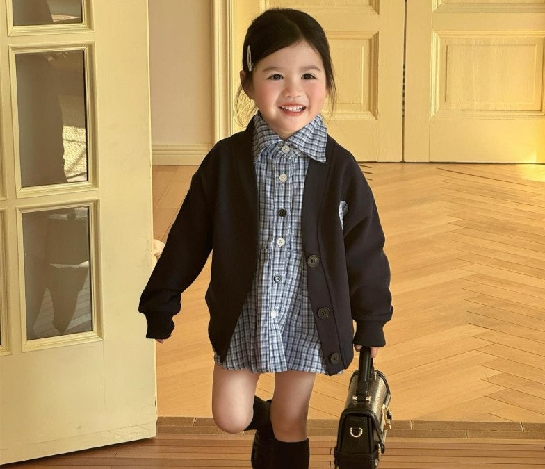 [수입]체크블루원피스가디건셋